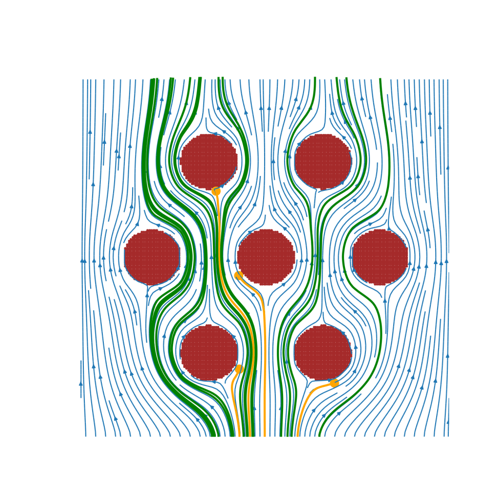 I am playing around with simple simulations of particles in air flowing through simple models of masks. Masks are made from long thin fibres, so usually people model the flow around cross-sections of long cylinders, which as you can see above are just discs (shown in brown). The air flows between these cylindrical fibres. The air flow is shown above by the blue stream lines that show the paths taken by the flowing air between the fibres. The air flows from bottom to top in the image above. This air carries particles with it, and trajectories of 20 example particles are shown as green and orange curves.