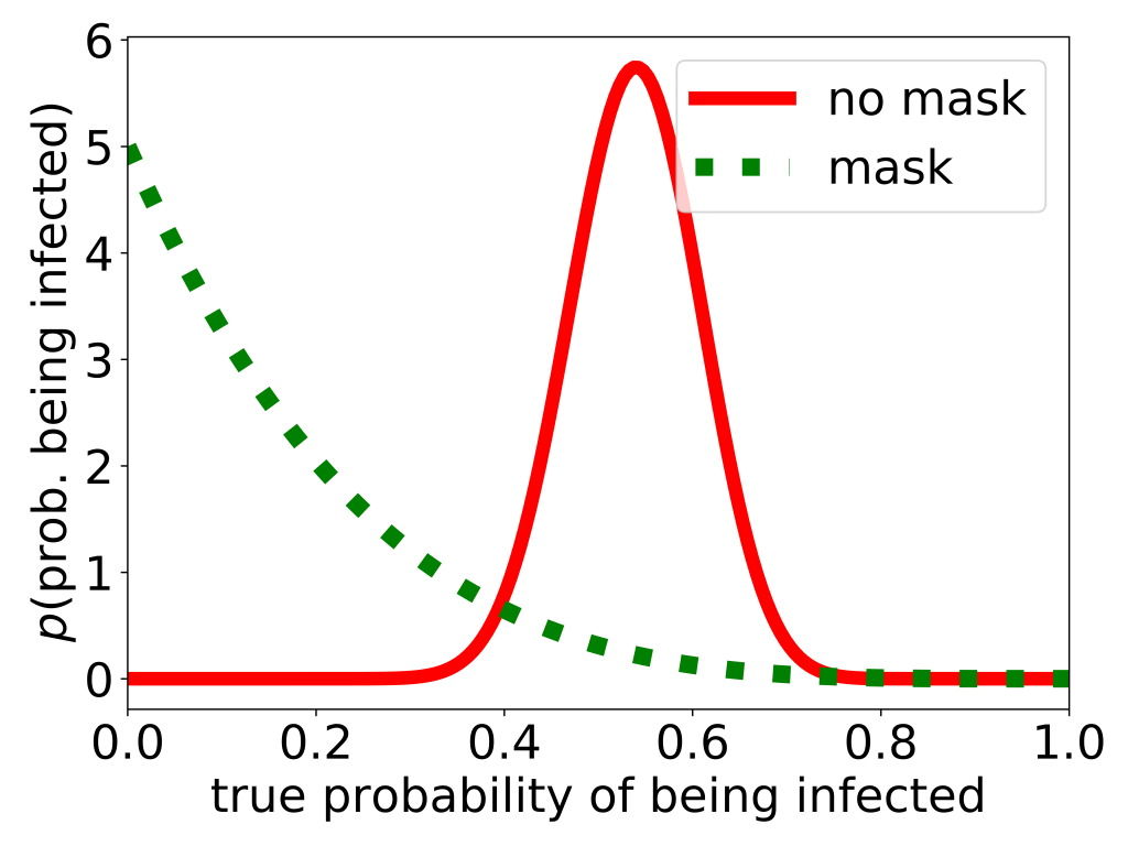 *** I used Bayesian statistics and started from a position of complete ignorance, i.e., assumed at the start that the probability of being infected could be anything from 0 to 1, both with an without a mask. This is what is called the prior in Bayesian statistics. Then all I need is the binomial distribution to give the me the probability density for the number of infections as a function of the true probability of becoming infected. I actually teach what is mathematically exactly the same problem to second year students.