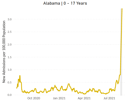 I saw the above plot in a streamed (on YouTube) set of talks and panel discussion: Delta Concerns of U.S. School Reopenings and Reducing Airborne Transmission. The plot was shown by a Boston University academic, Julia Raifman. The talks were a remarkable, and scary watch. Although the mortality rate due to COVID-19 in children is very low, about 1% of children infected are admitted to hospital, and of those, about one in three require intensive care.