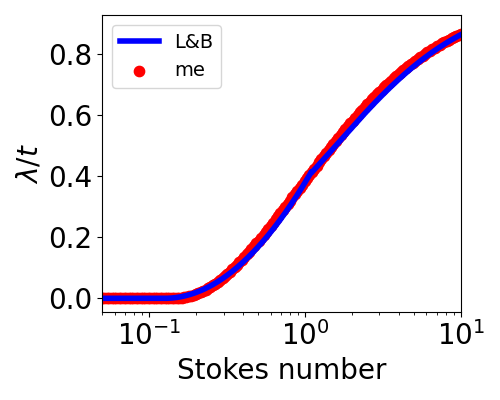 The red curve is from calculations I did yesterday evening using a Python code on my linux machine at home. The ratio λ/t goes from zero – so no particles collide – at small Stokes number, to close to one for large Stokes number. For droplets with Stokes numbers around 10 (which are droplets 100 micrometres in diameter), a wing of thickness t captures all the droplets of this size in the air over a strip of width about 85% of t.