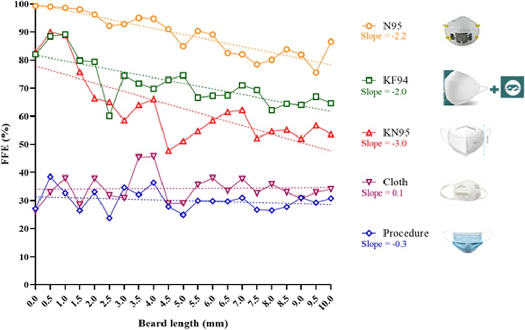Figure 3 of Prince et al. is above. It shows the % of particles of a test aerosol* that are filtered out as a function of the length of beard of the man wearing it. FFE stands for Fitted Filtering Efficiency, i.e., filtering efficiency while worn. So the far-left-hand points gives how good a mask is when worn by a clean-shaven man, while on the far right, is the effectiveness for a man with a beard with hairs 10 mm or 1 cm long. This is a very nice piece of work by Prince and coworkers.