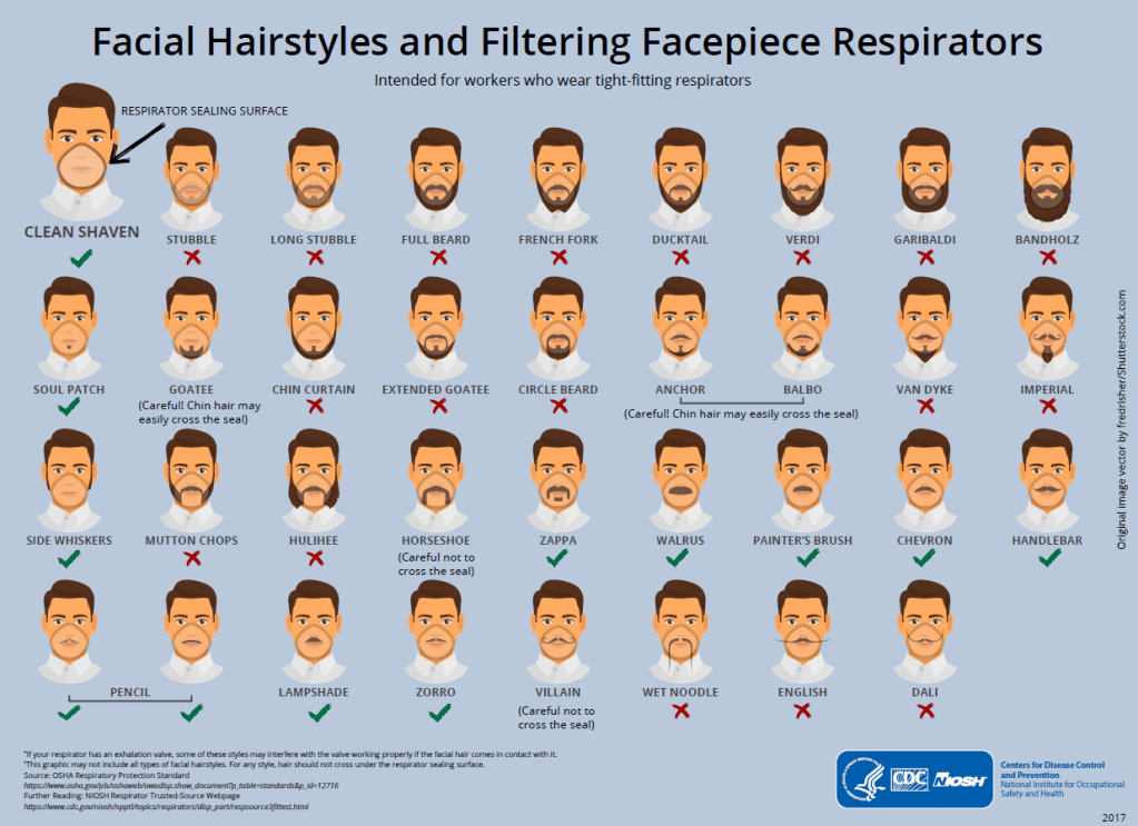 Back in the carefree year 2017, the USA Centers for Disease Control (CDC) produced the above guidance for healthcare workers who needed to wear masks for work, but favoured facial hear. It was motivated by Movember. The green ticks mean that the style of facial hair is compatible with wearing a fit-tested mask, the red crosses indicates that the style is not allowed, and those healthcare workers who need to mask-up at work will need to get the razor out. Most moustaches are allowed but almost all beards are banned as there is then facial hair where the mask has to fit tightly to the skin (see top left of image) to get a good seal and prevent air leaking around the edges.