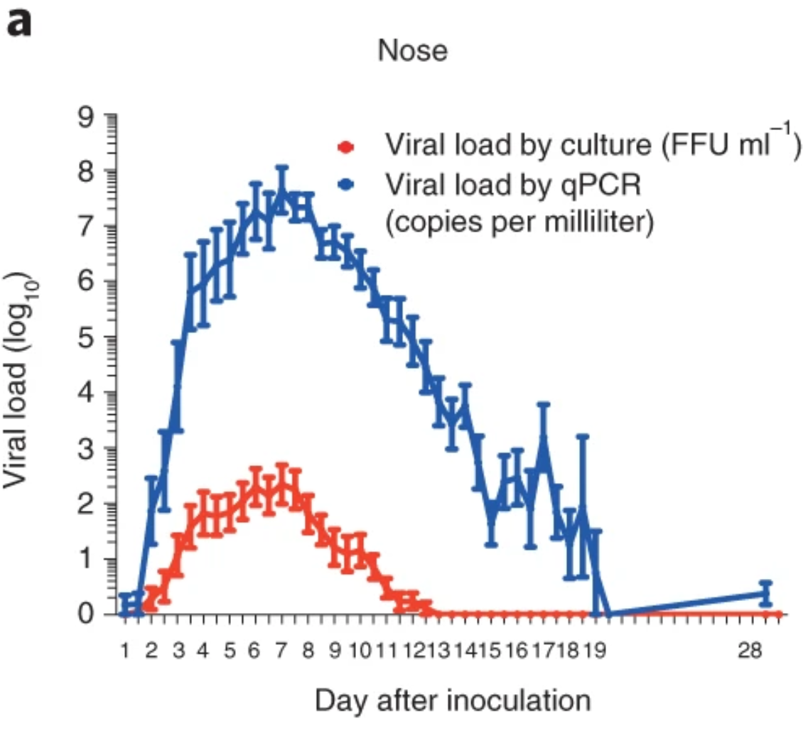 * It is worth noting that they were infected by dropping virus into the nose, which is different to inhaling airborne virus – which is likely how most become infected naturally. This may affect the course of the infection.