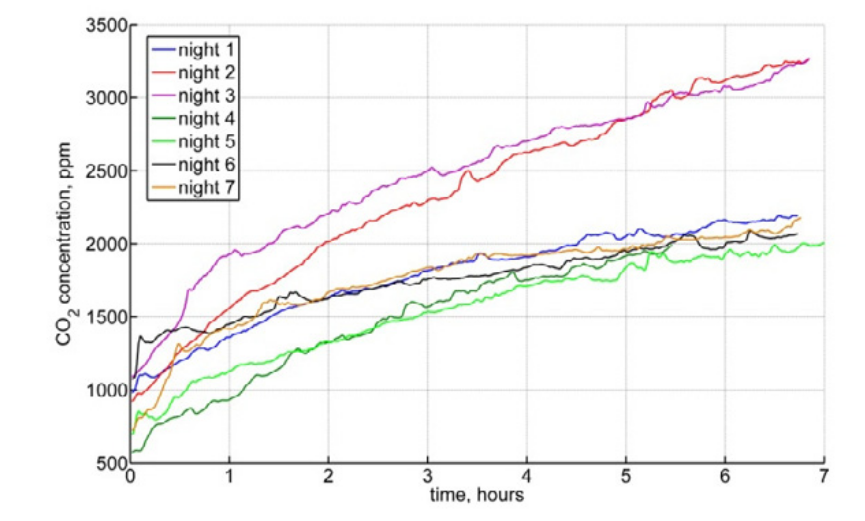 As Batog and Badura note, the lower set of CO2 profiles are consistent with air in the bedroom turning over at about 2 litres/second or 7 m3/h**. For a 21 m3 bedroom this airflow turns over the air in the room once per 3 hours. The steady state concentration (that the profiles are tending to) is then just volume of air breathed out per hour times the CO2 concentration in breath times time to turnover the air in the room, divided by volume of the room. This is about 3,000 ppm. The blue, gold and black profiles above look they are tending towards about 2,500 ppm, over a timescale not far from 3 hours, so 2 litres/s looks about right.