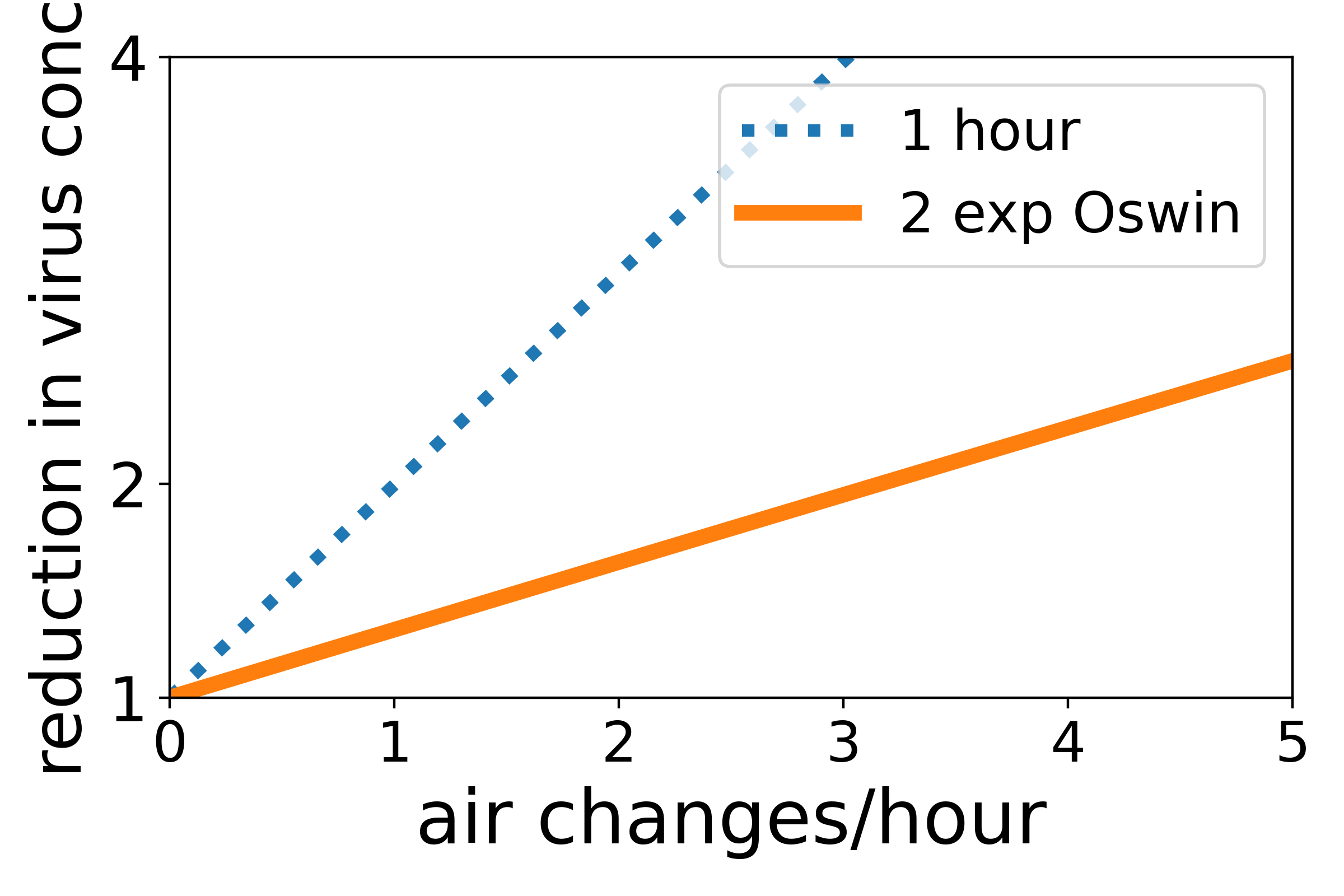 This prediction is very sensitive to how long we think the virus survives in air. Ventilation at a rate r reduces transmission when r is about one over the lifetime of the virus in air, or larger. So if the lifetime of virus is about 20 minutes, then turning the air over every 20 minutes, i.e., three times per hour, halves exposure. But if the lifetime is an hour, then you only need to the turn the air over once per hour to get the same affect (at steady state). Alternatively, if the lifetime is an hour, then changing the air every 20 minutes (3 changes per hour) reduces the amount of virus present by a factor of four – see dashed blue line above.
