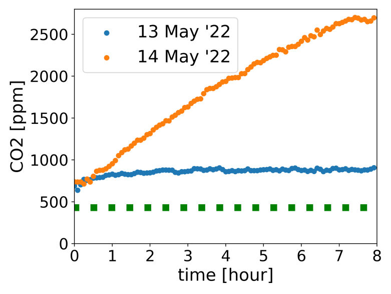 Anyway, that is the theory. With my new CO2 meter I can test it. In the plot above, the blue circles are CO2 measurements every five minutes from a CO2 meter in my bedroom overnight on Friday night, while I slept (green dashed line is approximately the concentration outside). I left a small window open just a little bit; the window is 50 cm wide and opening was very roughly a couple of centimetres. It is not easy to see from above plot (sorry!) but overnight CO2 levels rose from between 600 and 700 to over 900 ppm. I was clearly breathing out CO2 a bit faster than the air was coming in and out of the small opening. During the day I had windows open so CO2 was about 600 ppm.