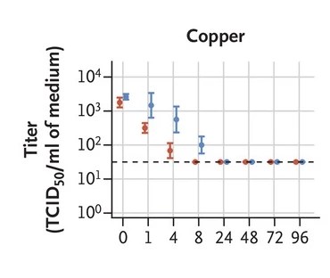 A plot from some of the earlier work is shown below, it is work of van Doremalen and coworkers in 2020, and is for virus on a copper surface. The red points are for SARS-CoV-2, the virus that causes COVID-19 while blue points are for SARS-CoV-1 – the less infectious virus that gave us a scare (which we didn’t learn from) about 20 years ago.