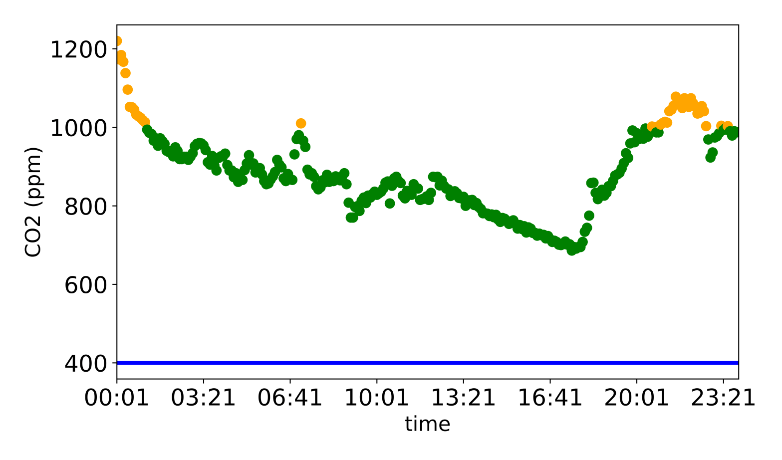 When I was out at wok the CO2 level slowly dropped, even though the windows were then all closed. Even with all windows closed, the flat leaks a bit and the only CO2 source (me) was not present. The CO2 concentration in the atmosphere is a bit over 400 ppm (shown as green line), so with no CO2 source inside, the CO2 concentration tends to relax to the 400 ppm of outside air. The slope suggests that with all windows closed the air in the flat turns over very roughly once a day.