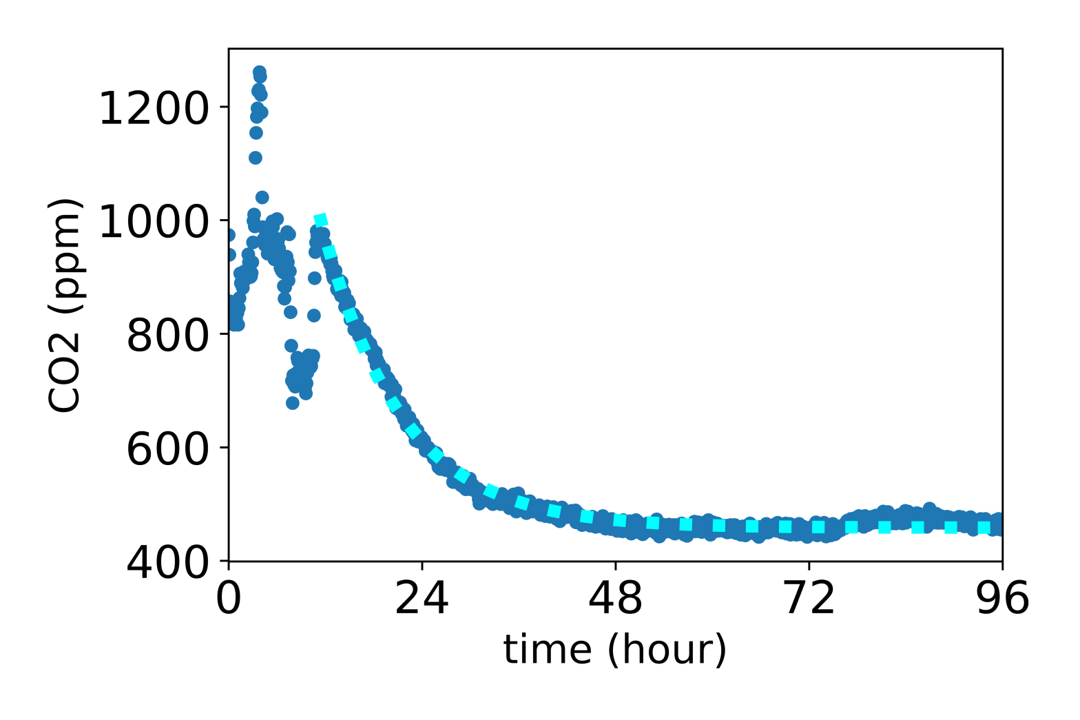 Over part of Christmas I was away for a few days. As you can see from the plot, this was long enough for the CO2 concentration inside my flat to relax to the atmospheric value (or close to that) of a bit over 400 ppm. The plot has time as the x-axis, starting at midnight of the day I left. I left at about midday of the first day and the CO2 concentration then relaxed back to about 450 ppm, and stayed there. The relaxation is well fit by an exponential function with a time constant of close to ten hours. The fit is the dashed cyan curve.