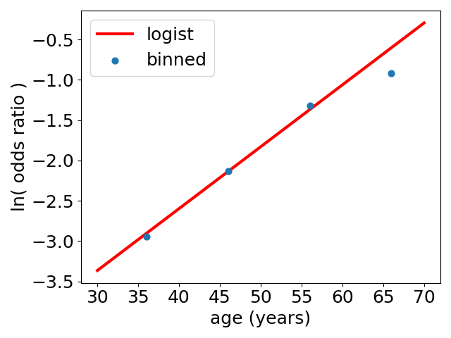 As you can see it is not very far from a straight line, apart from overpredicting the risk for people in their 70s. It looks like an exponential growth of the odds ratio for heart disease is a pretty reasonable first approximation., and so the logistic model is a sensible way of predicting how the risk of heart disease varies with age.