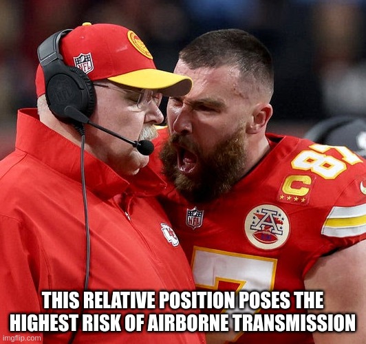 So if you want to remember what situation poses the highest risk of transmission of COVID-19, flu and other airborne diseases, think of Travis Kelce and Andy Reid, and the 2024 Super Bowl.