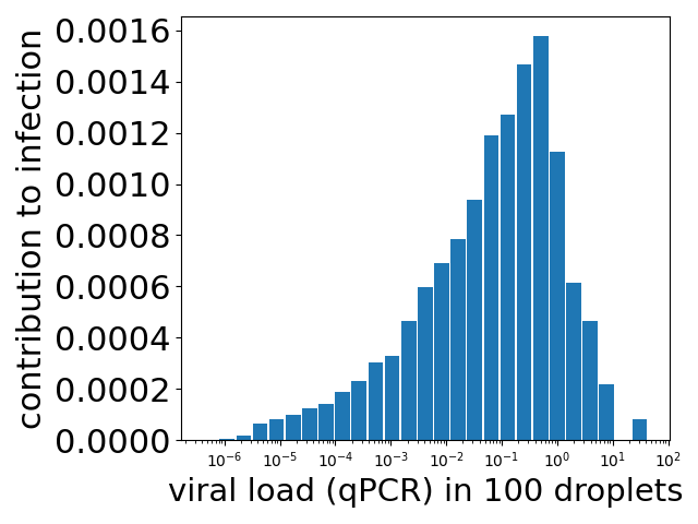 Some infected people have concentrations (qPCR measured) a million times higher than others. This variability translates into a huge spread of possible expected mean number of viruses inhaled, if you inhale 100 droplets. The height of each bar in the plot at the top is the fraction of people who have a viral load such that 100 aerosol droplets contain (on average) the number of viruses given by the value along the x axis. For example, the bar at a value of 1 (=100) has a height of 0.02, i.e. 2% of the population of infected people have enough virus in the saliva so that the 100 droplets contain an average of 1 virus.