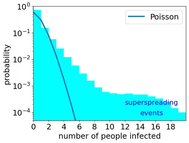 Although good systematic data are lacking there are observations of what are called superspreading events. These are single events at which many people become infected. An example from early in the COVID pandemic is the superspreading even at a choir practice in Skagit Valley (USA) where it is likely that 53 attendees were infected in one event. Transmission is a random process. So just by chance we expect sometimes one person becomes infected at an event, sometimes by chance two or three, or …. So we always would expect at least some superspreading events. But how many?