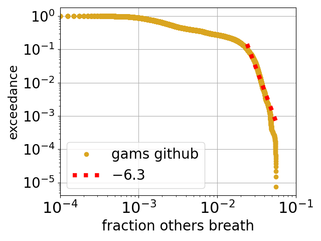 In the plot above, the black circles are data for the probability of infection with COVID, as a function of the time exposed to an infected person. The data are from the NHS app many of us in the UK used during part of the pandemic, and analysed by people at the UK Health Security Agency (HSA) and Oxford University. It was published by Ferretti et al.. The orange line is a power law fit to the data, with exponent (= slope on this log-log plot) of 0.47. It is a decent but not perfect fit to the data. The fit can be viewed as a purely empirical function that just describes the data. But it can also be – after the fact – justified by saying that if you combine the standard Wells-Riley model for disease transmission with a power law distribution of transmission rates, then you can recover this power law.