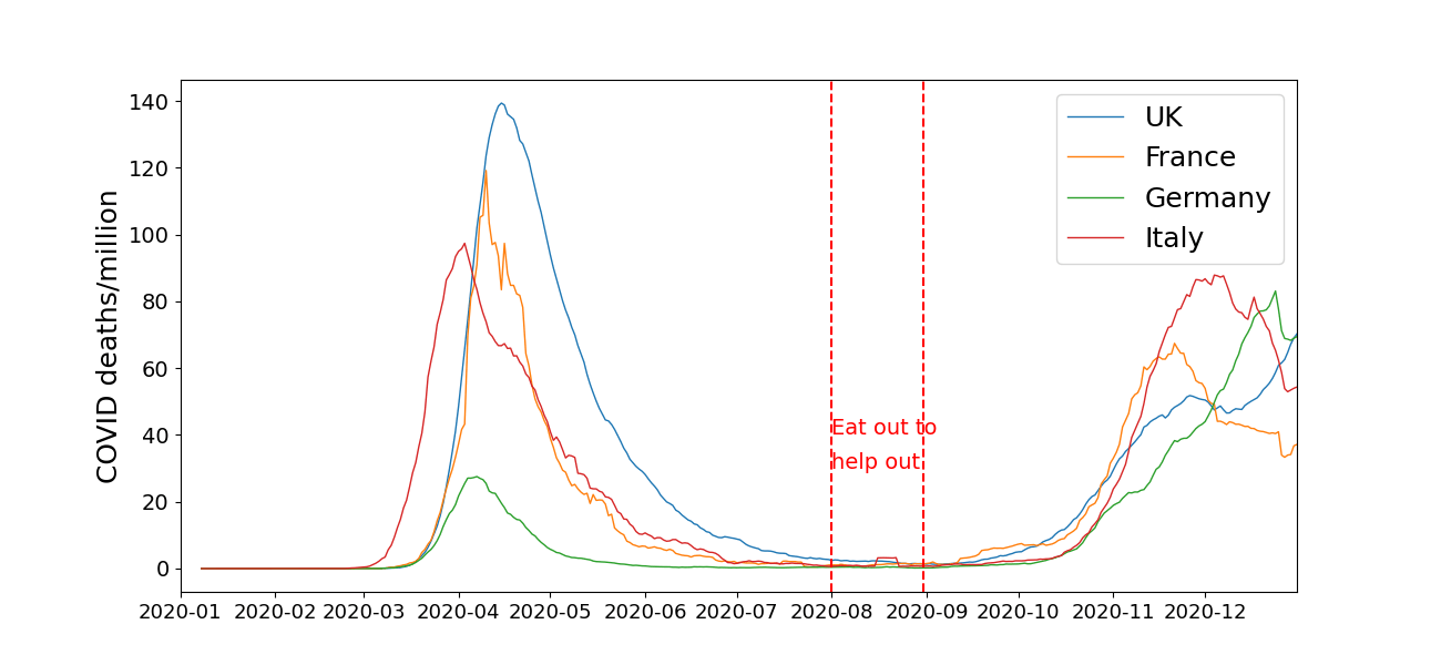 The graph above is a bad graph** – it is a replot (as original will be copyright of The Spectator) of a graph in The Spectator article Did Eat Out to Help Out rekindle Covid? A look at the data, by The Spectator‘s editor Fraser Nelson. Rishi Sunak’s Eat out to help out scheme ran for the month of August 2020, and in the article Fraser Nelson (a politics and history graduate) decides to “look at the data” and tell professional epidemiologists why they are analysing this epidemiological data incorrectly. This demonstrates either impressive self-confidence or eye-brow-raising-arrogance, depending on how sympathetic you are to Mr Nelson.