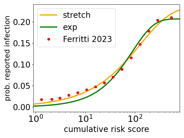 Above is a plot of the data of Ferretti and coworkers (green circles and crosses*) on the probability of infection with COVID, as a function of exposure, as measured by data from the NHS COVID-19 app. Note that it is on a log-log scale. The blue line is a power-law fit*, with best fit exponent β = 0.48, i.e., the probability of infection almost scales as the square root of the exposure (that would be β = 1/2). For comparison there is also a line (orange) showing what linear behaviour (β = 1) would look like. Clearly the data look a long way away from linear. And indeed Ferretti and coworkers do fit power laws and also get good fits, and a similar exponent.